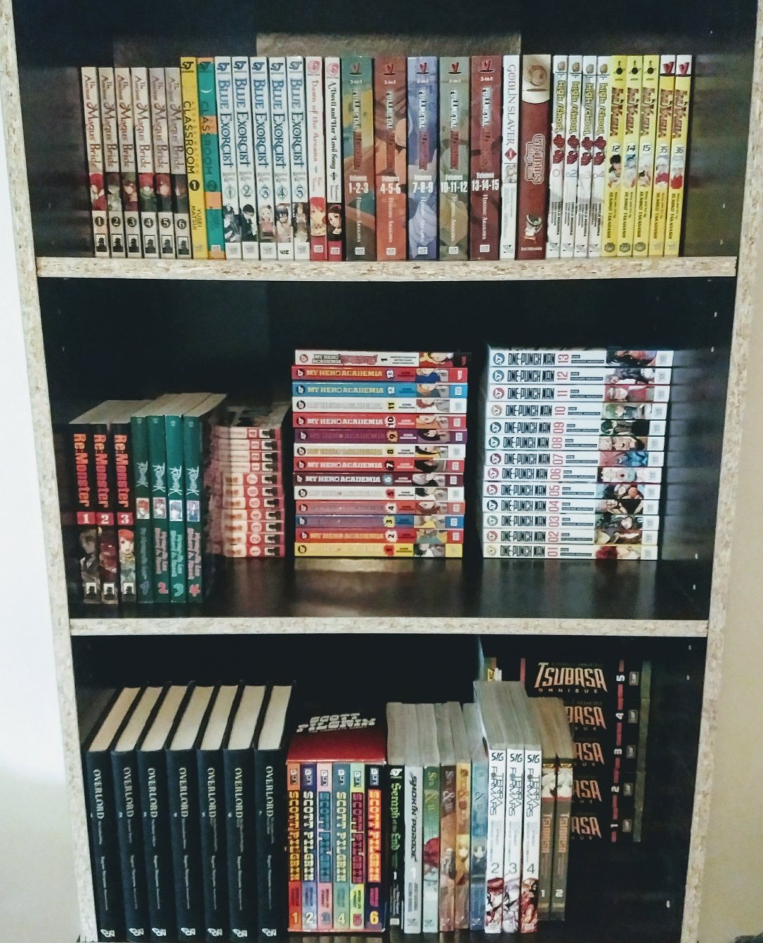 As for what the two of us will be reading, well it will probably be something on these shelves, though we may have added more volumes since this photo was taken. Oh and the shelving of the manga is not my decision. This bookcase is my fiance’s and he has complete control over where they all go and how they are stacked. He’s still figuring out his shelving preferences.