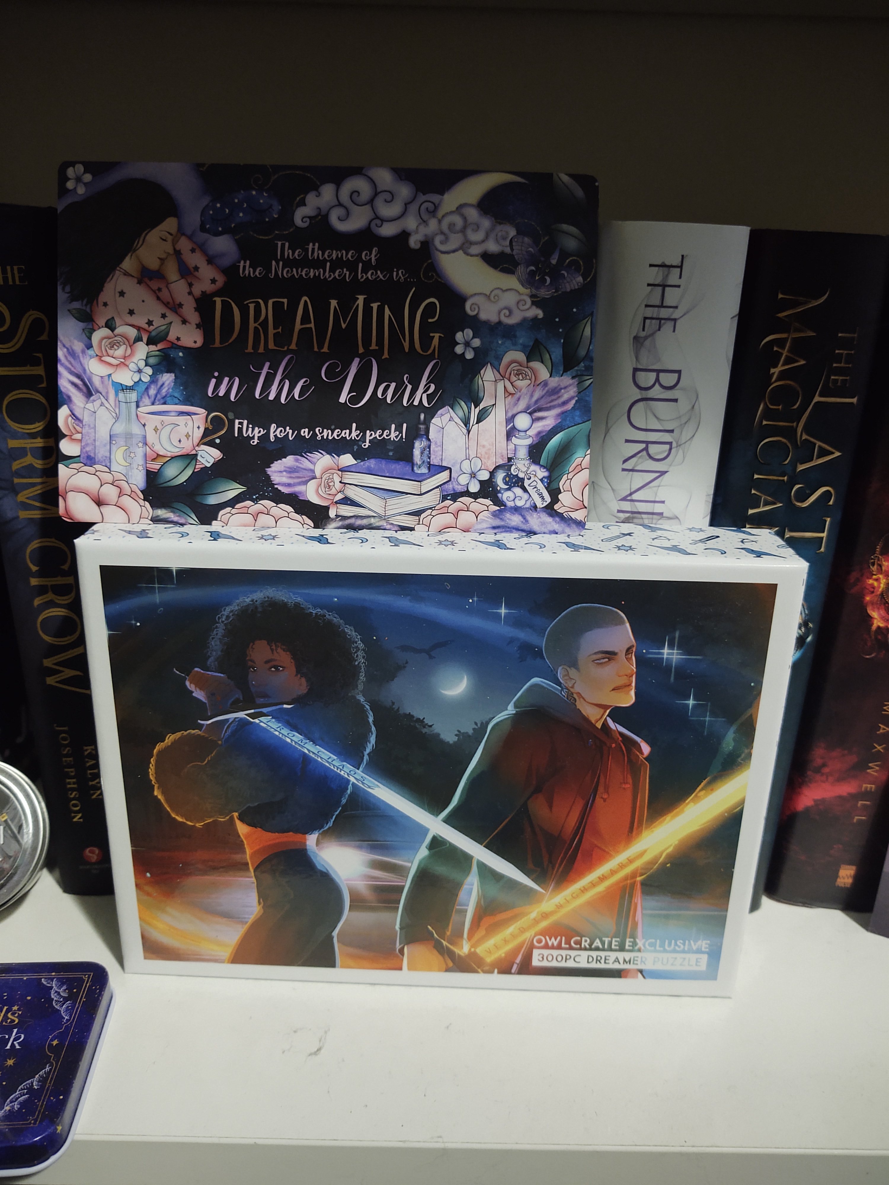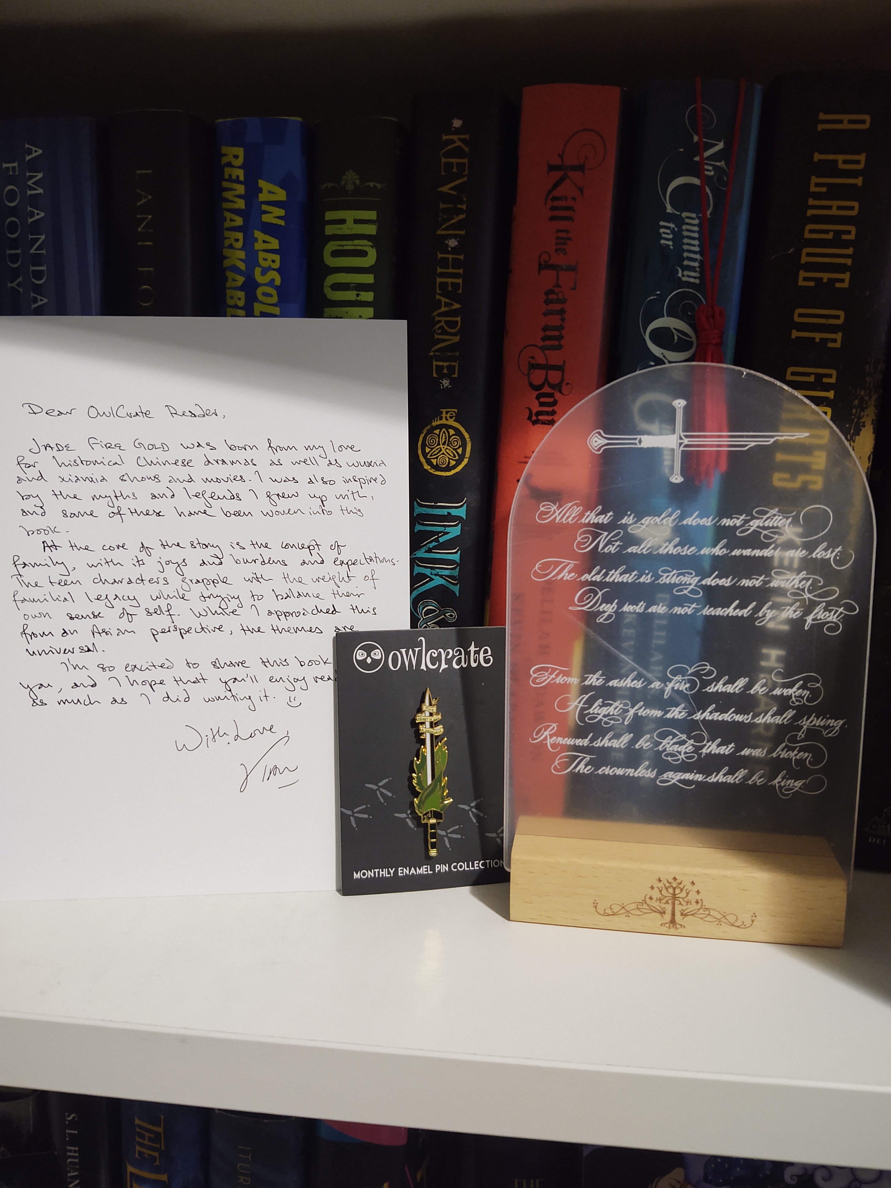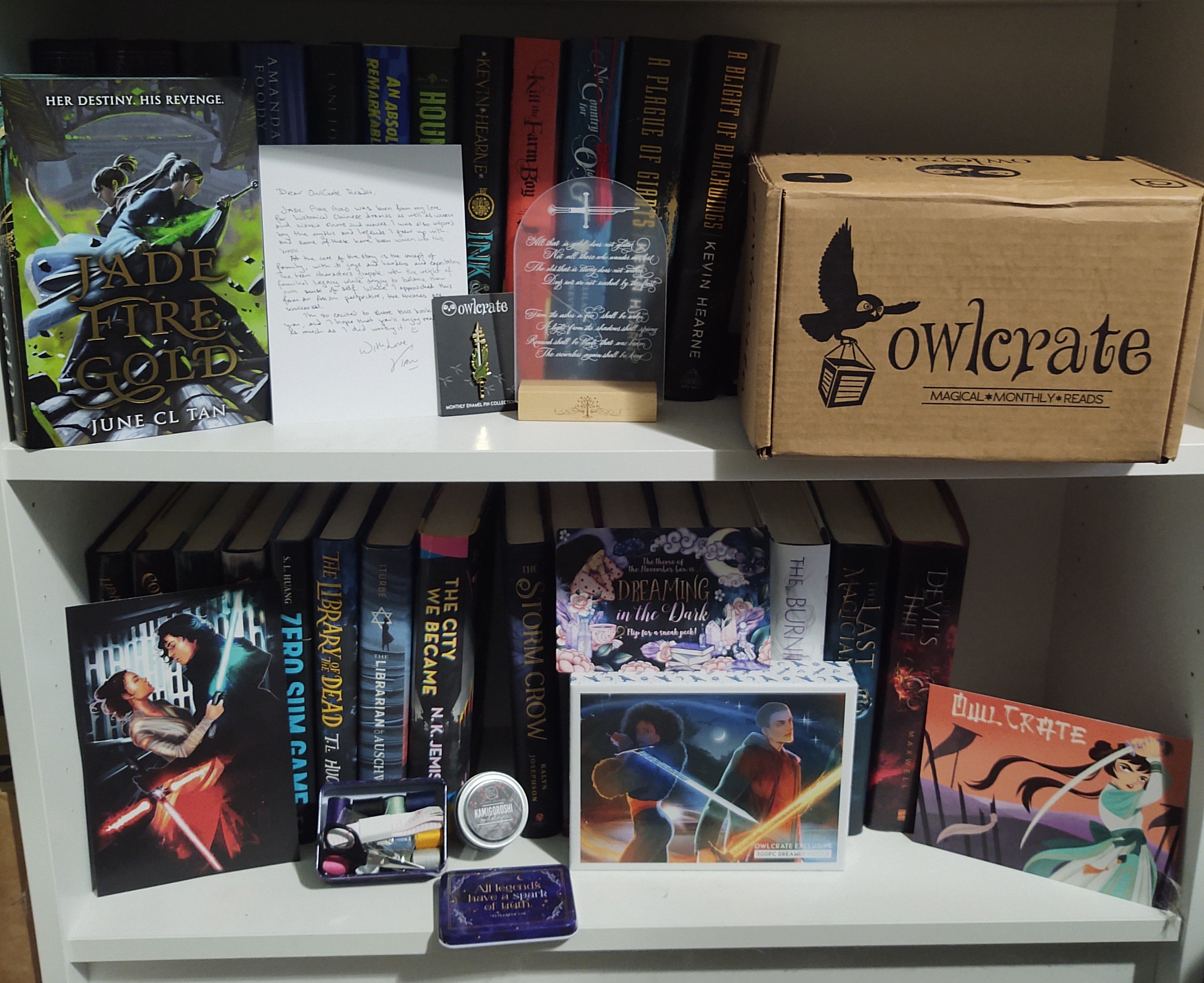 October’s theme was Wield Your Blade. That little sewing kit tin will be useful for when we start more regularly going to conventions, and I do really like the Lord of the Rings poem stand thing. The OwlCrate edition of Jade Fire Gold is pretty cool, but I do like the original better, so I’m glad that I have both.