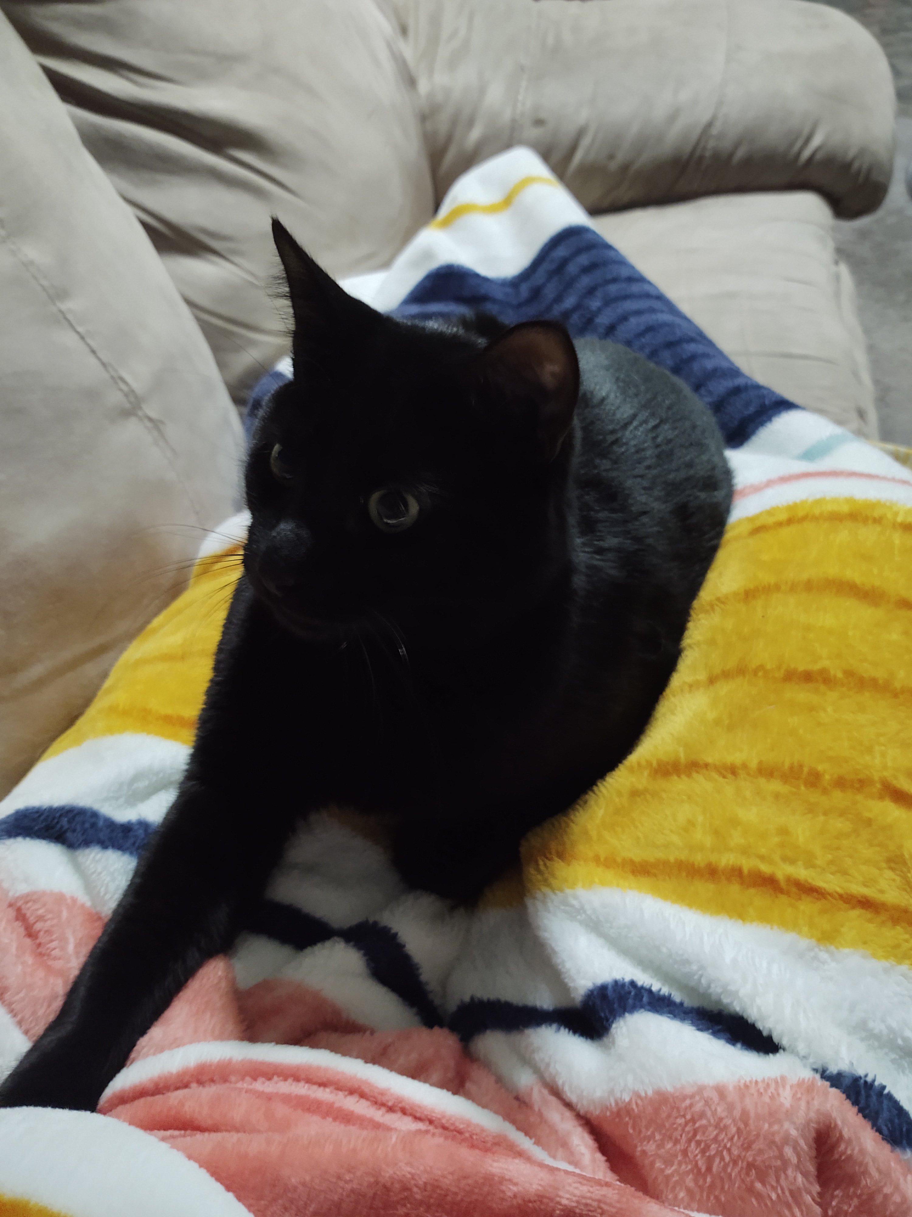 Diablo also likes to be involved in our D&D days, as can be seen by the photos where he is perched up on my dice bag or sitting in one of my friend’s dice trays. I think he likes those days best because there’s more people in the house who can love him. The final picture in this set is the day we came back from our honeymoon. We’d been gone for almost a whole week, and I think he missed his “mommy couch cuddles,” because he would not leave me alone.