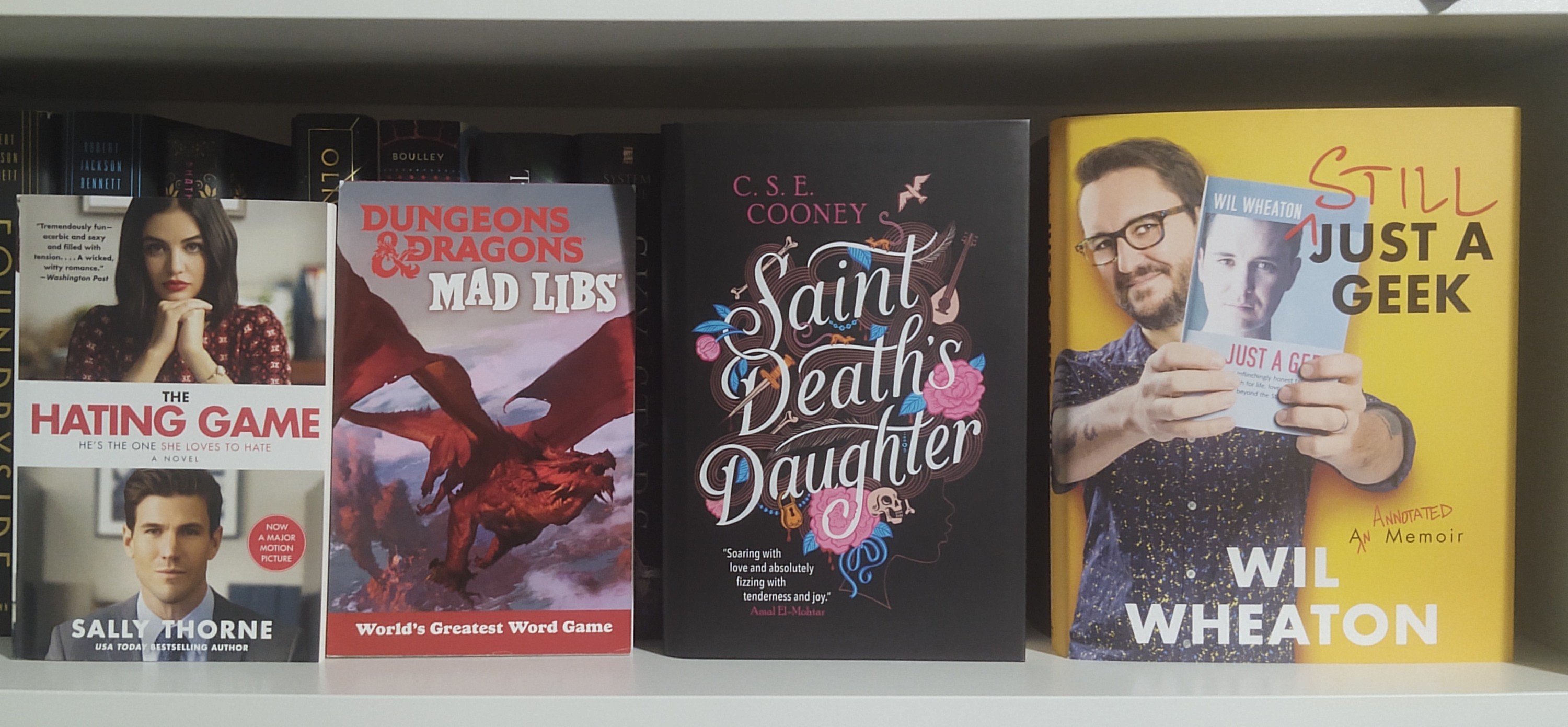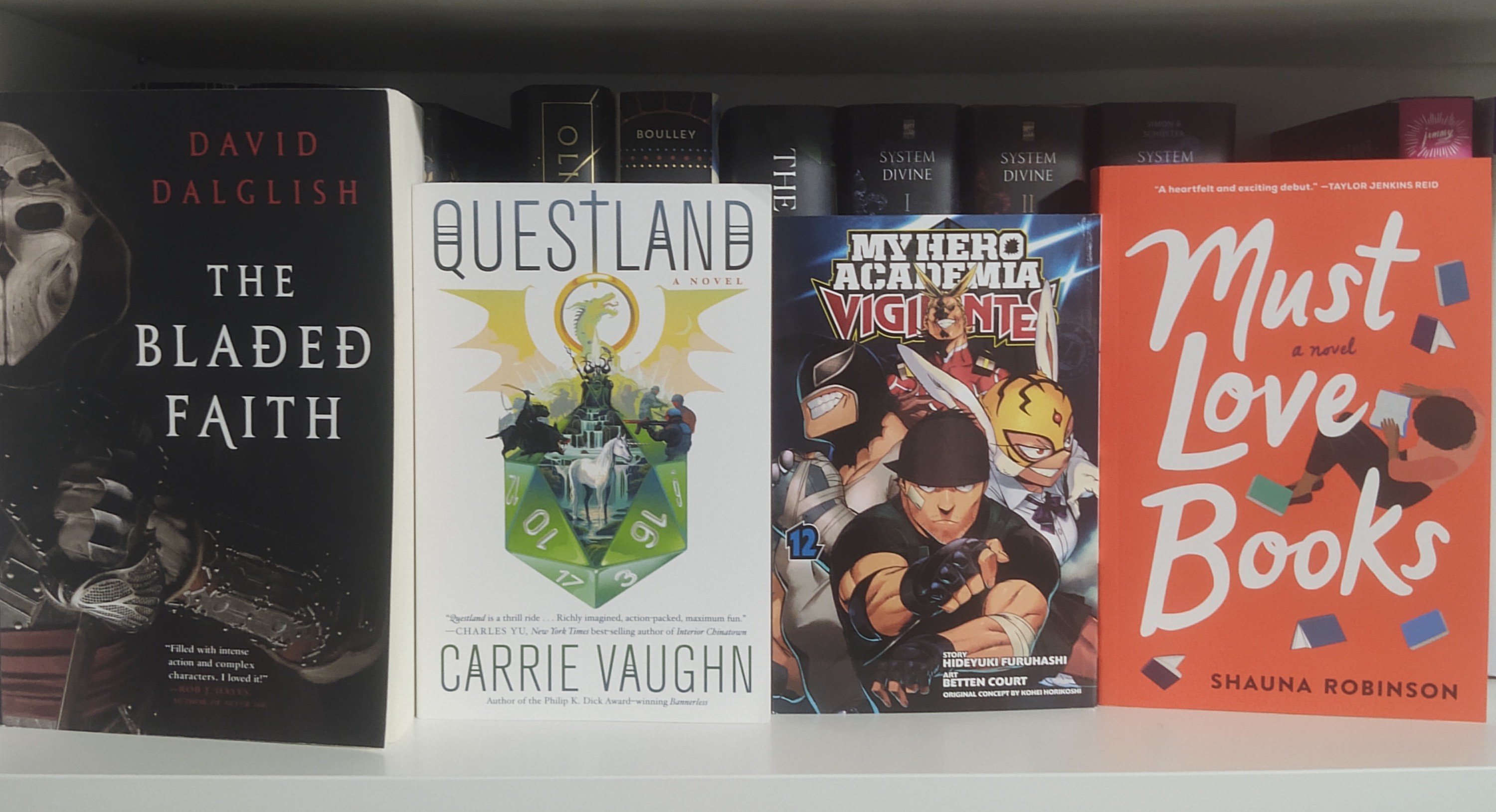 Hounded by Kevin Hearne, Hexed by Kevin Hearne, Hammered by Kevin Hearne, Temple of No God by H.M. Long, The Bladed Faith by David Dalglish, Questland by Carrie Vaughn, My Hero Academia Vigilantes Vol 12 by Hideyuki Furuhashi and Betten Court, Must Love Books by Shauna Robinson, A River Enchanted by Rebecca Ross, Dawnshard by Brandon Sanderson, The Wisteria Society of Lady Scoundrels by India Holton, City of Dusk by Tara Sim, The Kobold Guide to Worldbuilding Volume 2 edited by John Joseph Adams, A Magic Steeped in Poison By Judy I. Lin, Four Aunties and a Wedding by Jesse Q. Sutanto, Wild and Wicked Things by Francesca May, Paper & Blood by Kevin Hearne, The Bone Orchard by Sara A. Mueller, Middlegame by Seanan McGuire, Where Hope Comes From by Nikita Gill, The Hating Game by Sally Thorne, Dungeons & Dragons Mad Libs by Christina Dacanay, Saint Death’s Daughter by C.S.E. Cooney, and Still Just a Geek by Wil Wheaton.