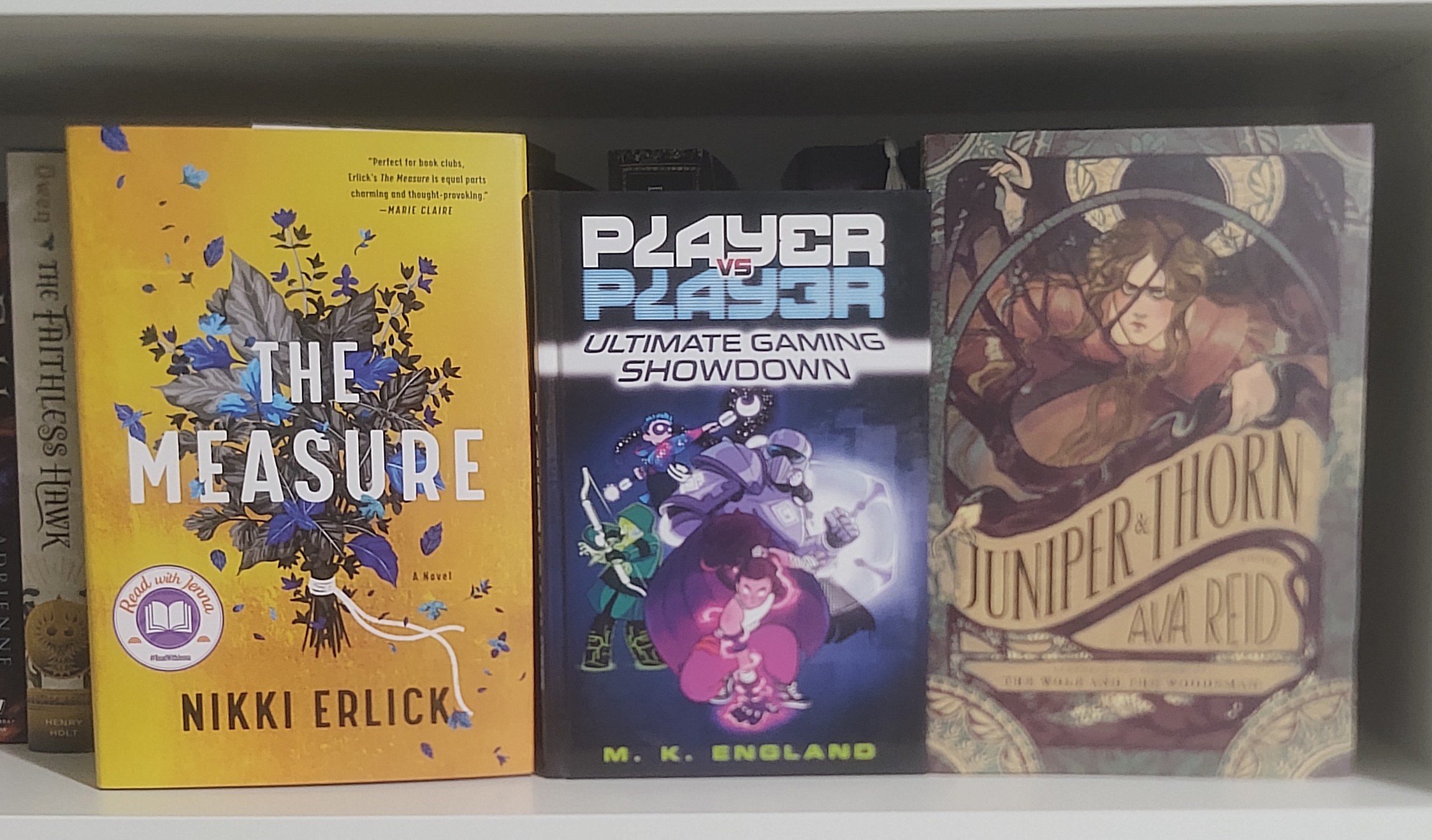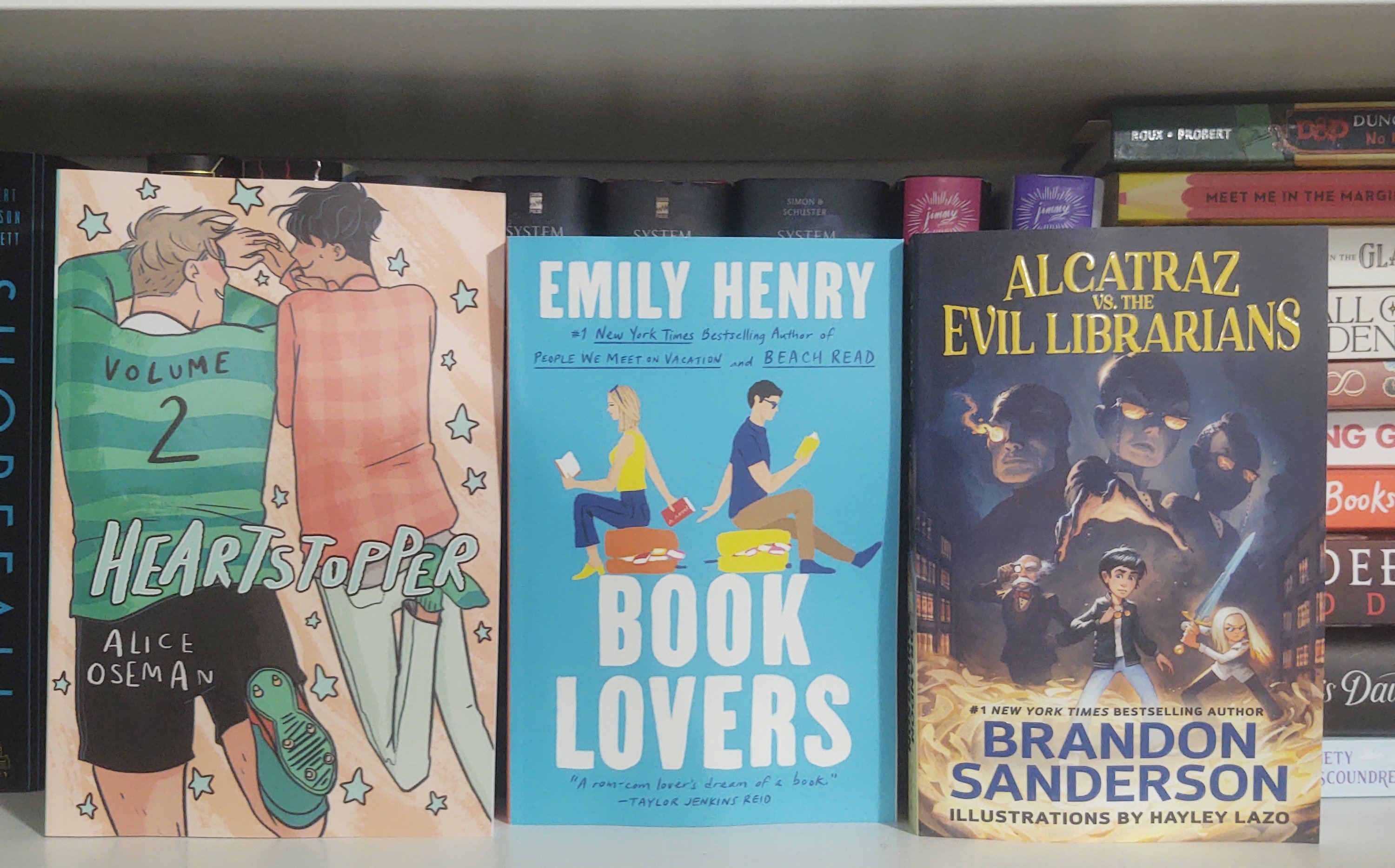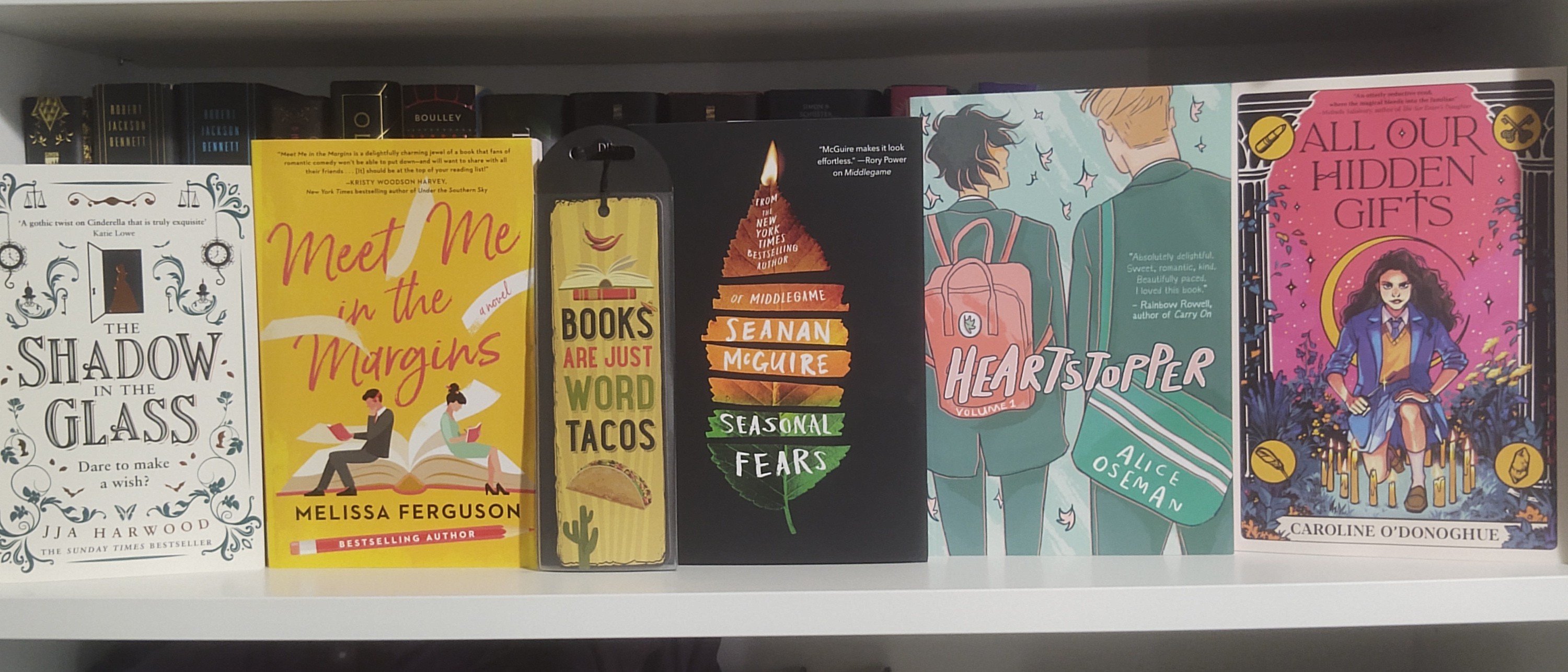 Okay, next up The Shadow in the Glass by J.J.A. Hardwood, Meet Me in the Margins by Melissa Ferguson, a Books are Just Words Tacos bookmark, Seasonal Fears by Seanan McGuire, Heartstopper Volume 1 by Alice Oseman, All Our Hidden Gifts by Caroline O’Donoghue, Forging Silver Into Stars by Brigid Kemmerer, For the Throne by Hannah Whitten, We Could Be Heroes by Mike Chen, Her Majesty’s Royal Coven by Juno Dawson, Unnatural Magic by C.M. Waggoner, Half a Soul by Olivia Atwater, Heartstopper Volume 2 by Alice Oseman, Book Lovers by Emily Henry, Alcatraz vs the Evil Librarians by Brandon Sanderson, Kagen the Damned by Jonathan Maberry, Castles in Their Bones by Laura Sebastian, The Stardust Thief by Chelsea Abdullah, In a Garden Burning Gold by Rory Power, Tricked by Kevin Hearne, Trapped by Kevin Hearne, Hunted by Kevin Hearne, The Measure by Nikki Erlick, Ultimate Gaming Showdown by M.K. England, and Juniper & Thorn by Ava Reid.