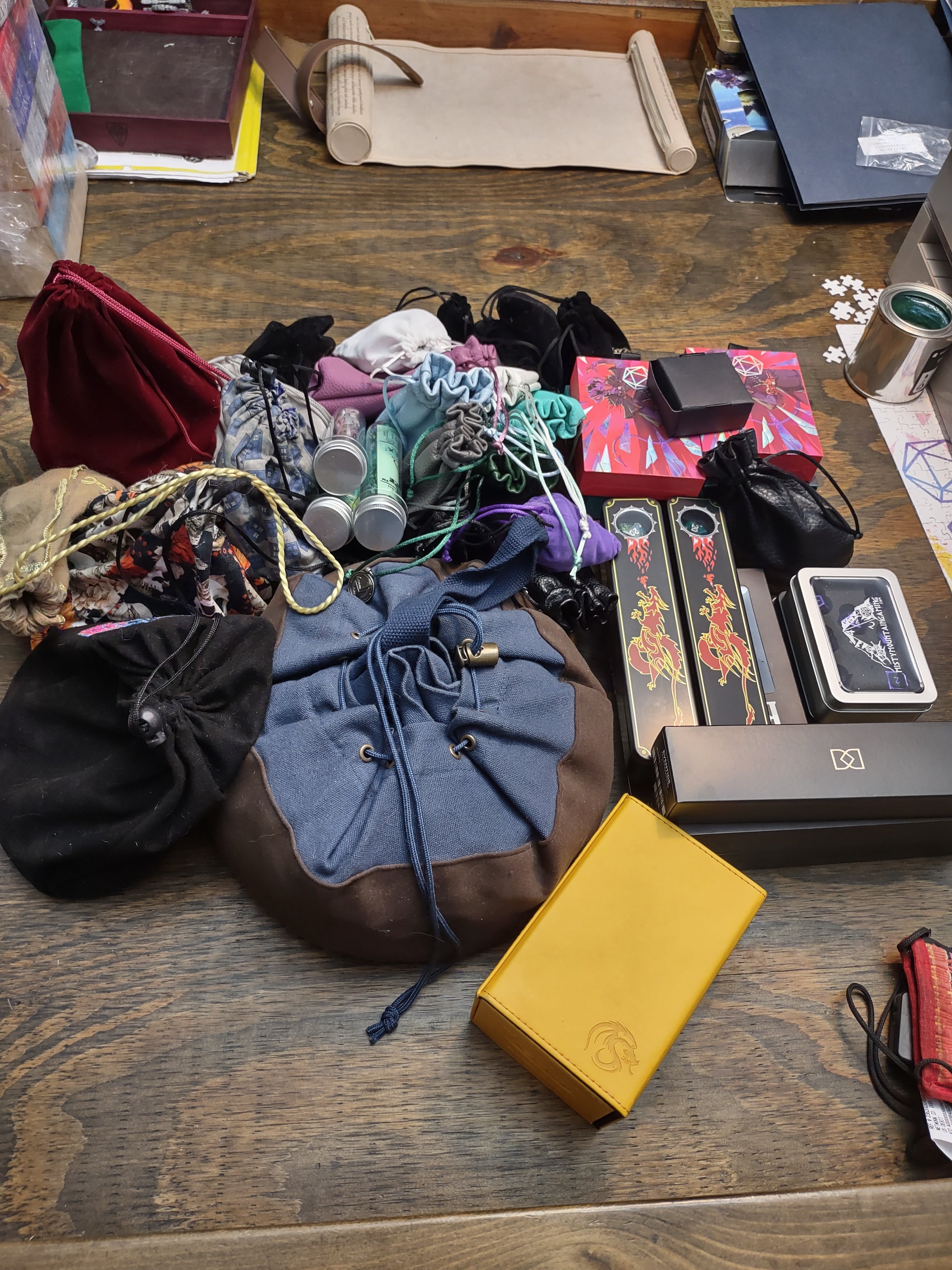 The second photo is everything from my blue Bailey’s Bag of Holding. For the record, the bag is so full that the drawstring doesn’t exactly keep the bag safely closed. Which is definitely a sign that I need to get another bag, because I just keep getting more dice. I remember a few years ago I sorted all of the dice out by set so I could see how many of each color I have. I should probably do that again before the next Gen Con, just in case there’s any color gaps.