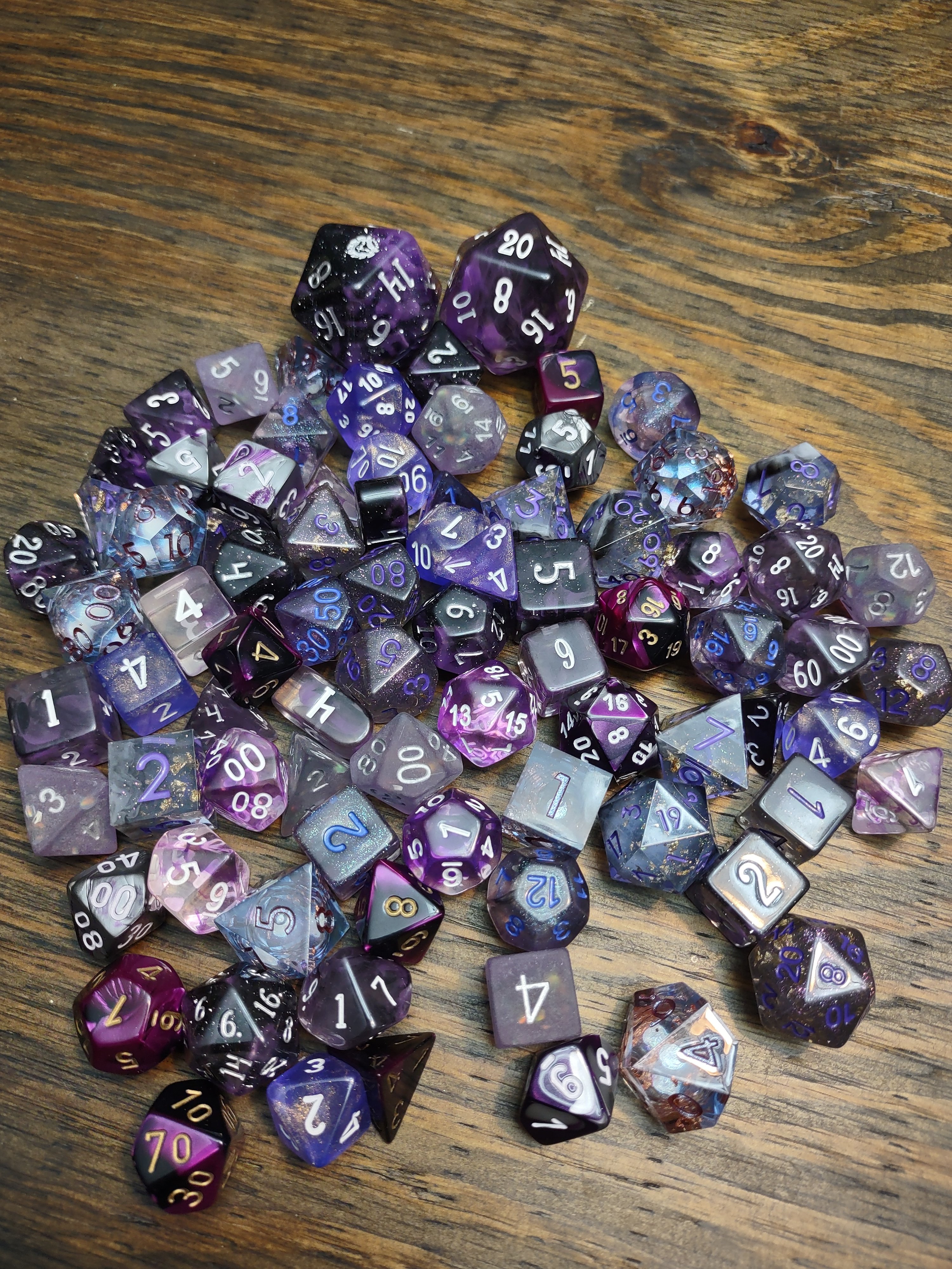 The photo on the left is for a new character/campaign that we’re starting in our new home, with some of the new friends we’ve made. We only played one intro to TTRPGs session (while traveling from Iowa to Massachusetts for a convention), but everyone wants to turn it into a campaign. My character for this one is Calamity, an Elf Cleric, and aesthetically with her, I just felt that purples and blacks went with how I saw her in my mind. Obviously, this is the starting selection. I fully expect some dice to leave the collection and for others to join as we get more into the campaign and the characters and the story. So, perhaps down the line I’ll share another post, and we can see how Calamity has changed via the dice I use to play her.