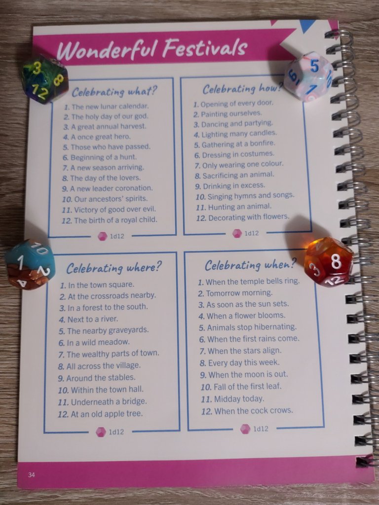 This month I decided to roll the dice on the Wonderful Festivals page in the Roll & Play book. You can use the dice I rolled, or if you have your own d12, you can roll on the chart yourself. Or heck, if you want to then you can just choose whichever option sparks your interest.