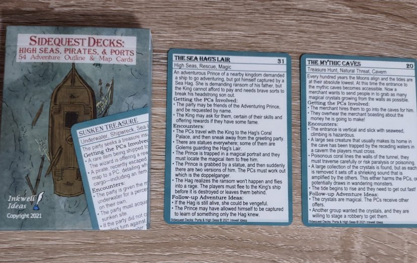 Finally, the Sidequest decks from Inkwell Ideas are another wonderful accessory designed for TTRPGs, but can easily be used for writers as well. This time around I used the High Seas, Pirates, & Ports deck, and again, I went with two options as prompt inspiration. You can use either option, and you can either use the basic concept at the top of the card, or you can use the various encounters at the bottom of the card to expand upon the adventure/story further.