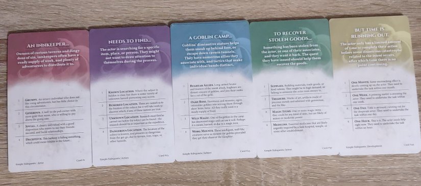 Finally, we have a new addition to the prompt generation: The Oracle Story Generator by Nord Games. They have a Character Generator as well, but that one won’t be shipped out for another couple months. I’ve only looked through a few of these cards before writing up this post, so I’m pretty excited to delve further into the story options with these decks. With this prompt, you can make it even more specific by either rolling a four-sided die for each card, or by simply choosing which option you like best.