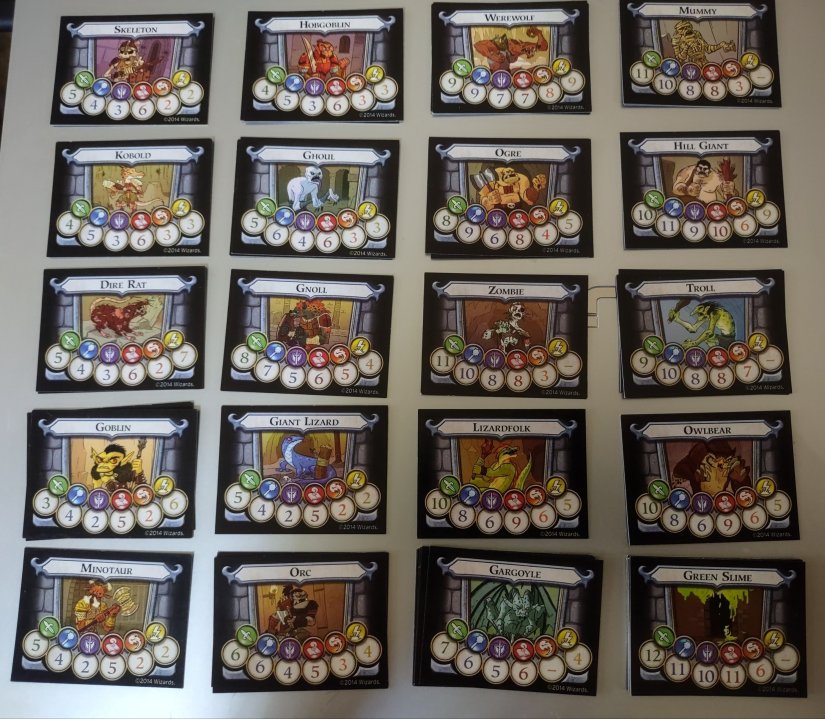 These photos showcase monsters from Levels 1 to 4 of the Dungeon: Column 1 is Level 1, Column 2 is Level 2, Column 3 is Level 3, and Column 4 is Level 4. For each monster there are different symbols with numbers attached. These represent the different methods for fighting them: Green for Rogues, Blue for Clerics, Purple for Fighters, Red for Wizards, Orange for the Fireball Spell, and Yellow for the Lightning Bolt Spell.
