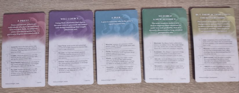 Finally, we have a new addition to the prompt generation: The Oracle Story Generator by Nord Games. They have a Character Generator as well, but that one won’t be shipped out for another couple months. I’ve only looked through a few of these cards before writing up this post, so I’m pretty excited to delve further into the story options with these decks. With this prompt, you can make it even more specific by either rolling a four-sided die for each card, or by simply choosing which option you like best.