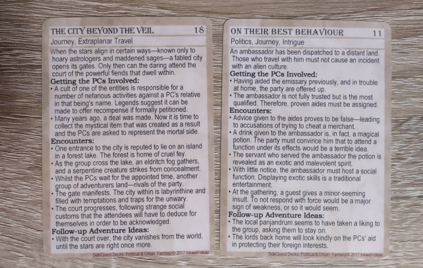 The Sidequest decks from Inkwell Ideas are another wonderful accessory designed for TTRPGs, but can easily be used for writers as well. This time around I went back to the Political and Urban Fantasy deck, and again, I went with two options as prompt inspiration. You can use either option, and you can either use the basic concept at the top of the card, or you can use the various encounters at the bottom of the card to expand upon the adventure/story further.