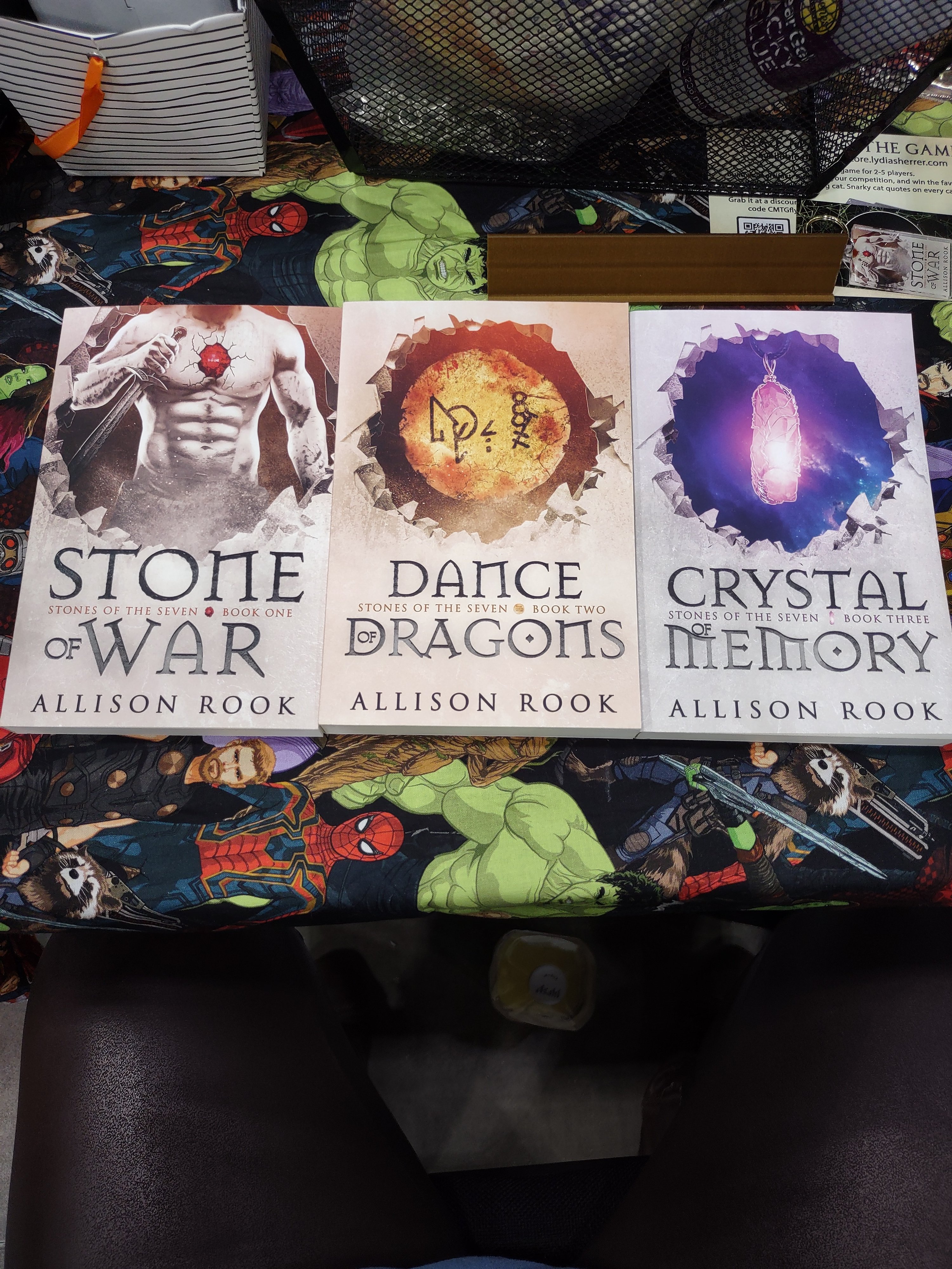 Other purchases included some adorable new desk buddies from our booth neighbor, KrystalineStudios, and she makes amazing 1:12 scale foods and other items for dollhouses and such, but she also makes so much more. Finally I picked up a fantasy romance series by Allison Rook: Stone of War, Dance of Dragons, and Crystal of Memory.