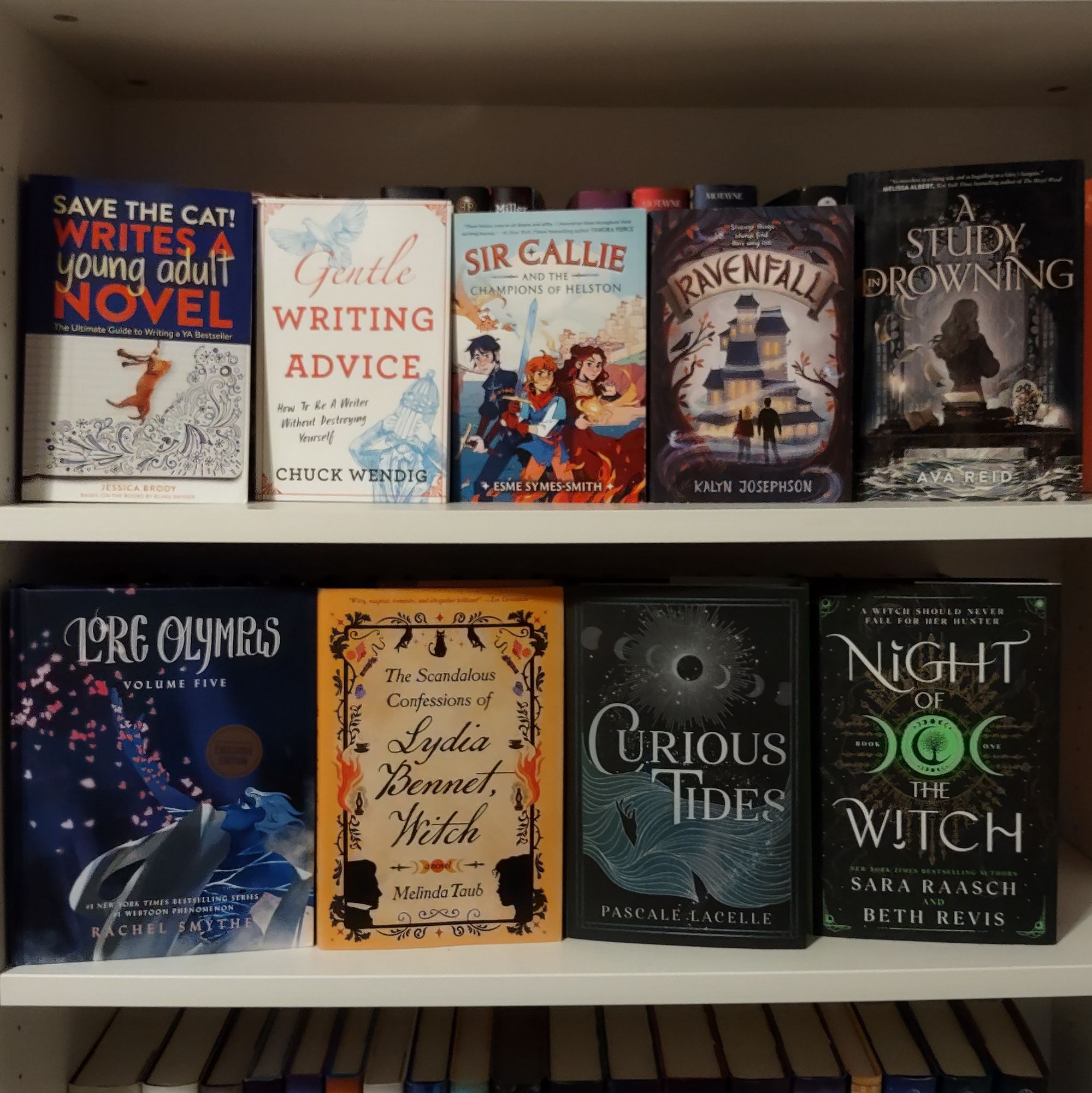 Percy Jackson and the Olympians: The Chalice of the Gods by Rick Riordan, Assistant to the Villain by Hannah Nicole Maehrer, Save the Cat! Writes a Young Adult Novel by Jessica Brody, Gentle Writing Advice: How to be a Writer Without Destroying Yourself by Chuck Wendig, Sir Callie and the Champions of Helston by Esme Symes-Smith, Ravenfall by Kalyn Josephson, A Study in Drowning by Ava Reid, Lore Olympus: Volume 5 by Rachel Smythe, The Scandalous Confessions of Lydia Bennet, Witch by Melinda Taub, Curious Tides by Pascale Lacelle, Night of the Witch by Sara Raasch and Beth Revis, The Quill and the Vial by Bree Moore, The Lady’s Last Song by Bree Moore, Raven Born by Bree Moore, Thief of Magic by Bree Moore, Trial of the Sun Queen by Nisha J. Tuli, The Book Club Hotel by Sarah Morgan, The Hexologists by Josiah Bancroft, House of Marionne by J Elle, Spellbinders: The Not-So-Chosen One by Andrew Auseon, and Unholy Terrors by Lyndall Clipstone
