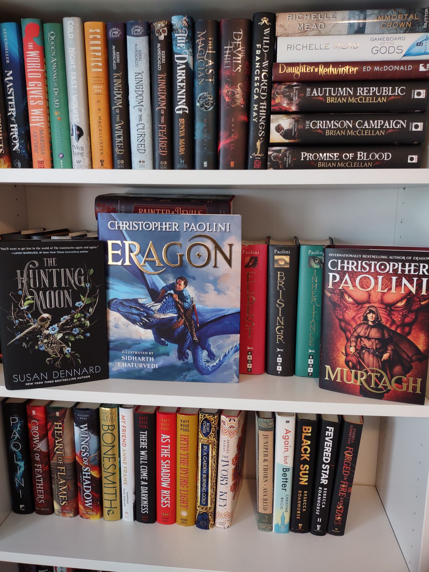 The Hunting Moon by Susan Dennard, Eragon: Illustrated Editions by Christopher Paolini, Murtagh by Christopher Paolini, Candela Obscura Rulebook by Darrington Press, an ARC for Evocation by S.T. Gibson, Ascension: Rise of the Phoenix by Jessi Lyn, The Darkness Before Them by Matthew Ward, Champion of Fate by Kendare Blake, Dark Moon, Shallow Sea by David R. Slayton, Tonight, I Burn by Katherine J. Adams, Assassin’s Apprentice by Robin Hobb, Gods of the Wyrdwood by R.J. Barker, and Barrow of Winter by H.M. Long