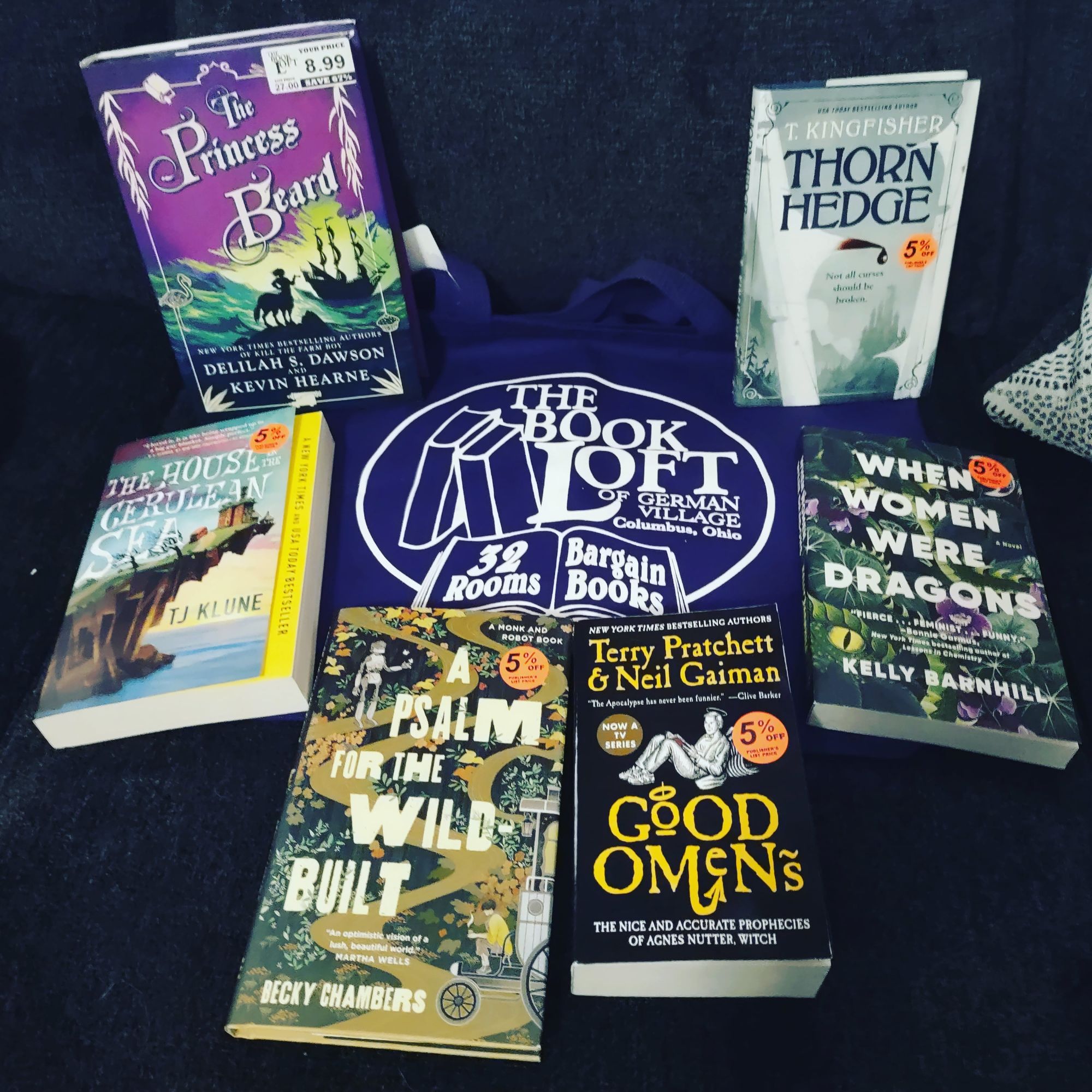 The Book Loft Mystery Box: The Princess Beard by Delilah S. Dawson and Kevin Hearne, The House on the Cerulean Sea by T.J. Klune, A Psalm for the Wild-Built by Becky Chambers, Good Omens by Terry Pratchett and Neil Gaiman, When Women Were Dragons by Kelly Barnhill, and Thornhedge by T. Kingfisher