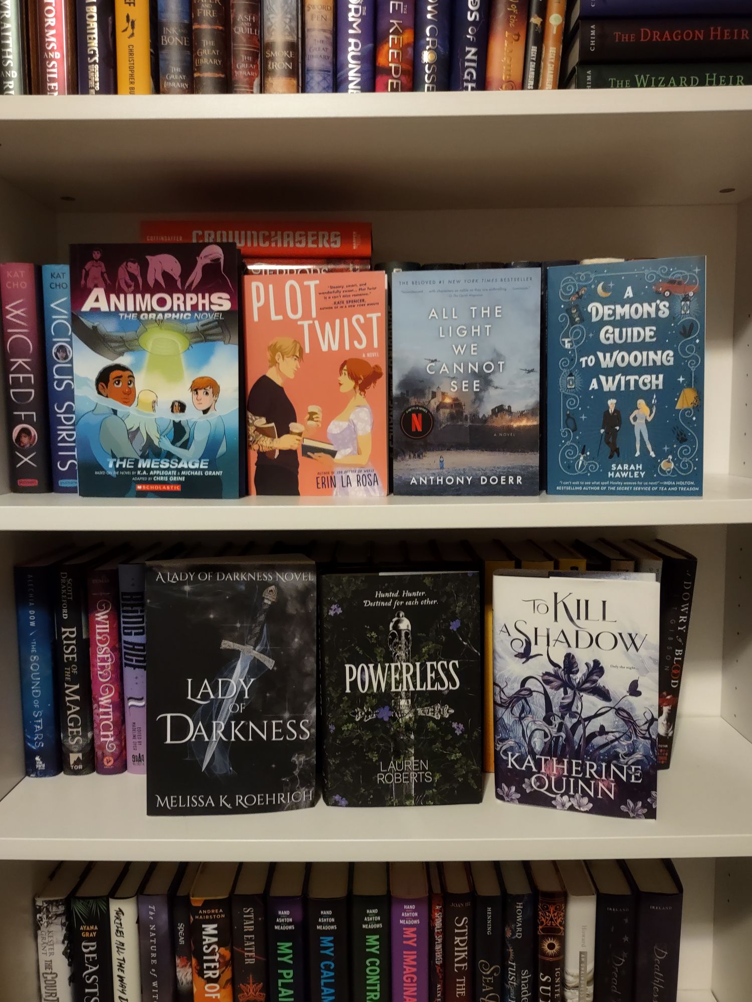 Animorphs #4: The Message Graphic Novel by K.A. Applegate and Chris Grine, Plot Twist by Erin La Rosa, All The Light We Cannot See by Anthony Doerr, A Demon’s Guide to Wooing a Witch by Sarah Hawley, Lady of Darkness by Melissa K. Roehrich, Powerless by Lauen Roberts, To Kill a Shadow by Katherine Quinn, How to Write a Successful Series by Helen B. Scheuerer, The Linchpin Writer by John Matthew Fox, A Fellowship of Bakers & Magic by J. Penner, The Serpent and the Wings of Night by Carissa Broadbent, A River of Golden Bones by A.K. Mulford, Rain of Shadows and Endings by Melissa K. Roehrich, Blood of the Earth by Heather Peck Quass, and Lady of Shadows by Melissa K. Roehrich