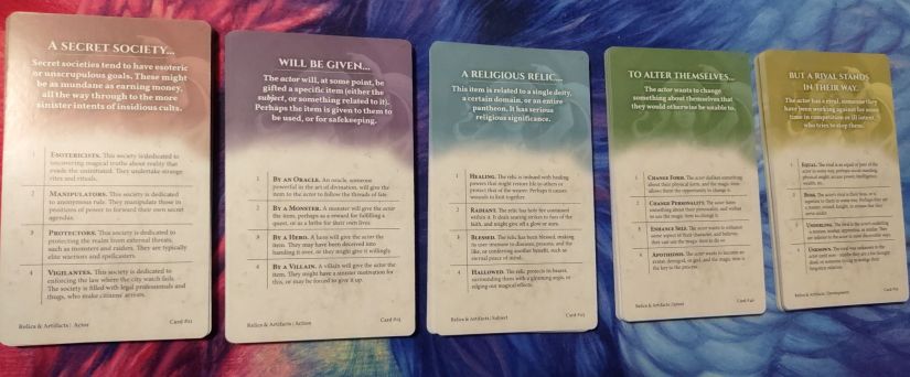 Next, we have The Oracle Story Generator by Nord Games. They have a Character Generator as well, but that one won’t be shipped out for another couple months. I’ve enjoyed playing around with these cards the past couple months, and look forward to doing even more with them in future. With this prompt, you can make it even more specific by either rolling a four-sided die for each card, or by simply choosing which option you like best.