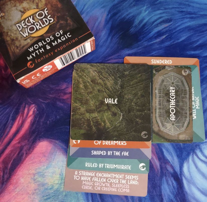A newer addition to the prompt generation is the Deck of Worlds by The Story Engine, and it works in a very similar way to the story deck, but it helps you think about and build either micro settings or small words or huge words with numerous countries throughout. It’s pretty cool.