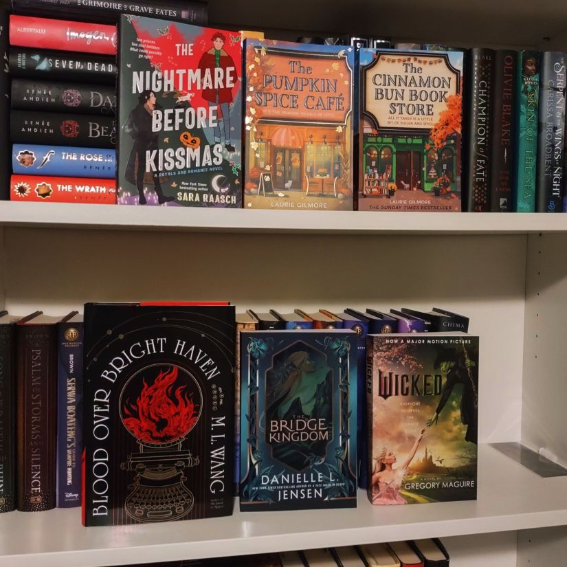 I picked up The Nightmare Before Kissmas by Sara Raasch, The Pumpkin Spice Cafe by Laurie Gilmore, The Cinnamon Bun Book Store by Laurie Gilmore, Blood Over Bright Haven by M.L. Wang, The Bridge Kingdom by Danielle L. Jensen, and Wicked by Gregory Maguire.