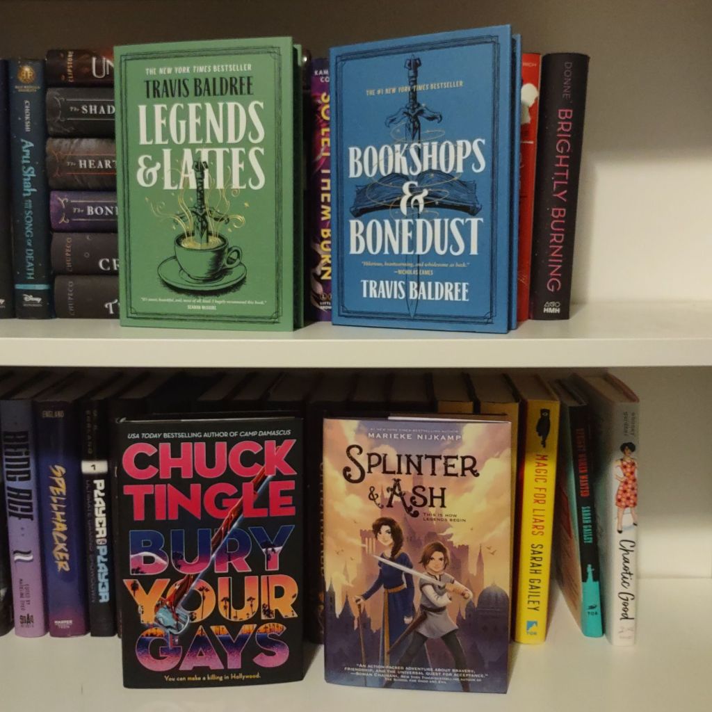 Image 1: Legends & Lattes by Travis Baldree, Bookshops & Bonedust by Travis Baldree, Bury Your Gays by Chuck Tingle, Splinter & Ash by Marieke Nijkamp