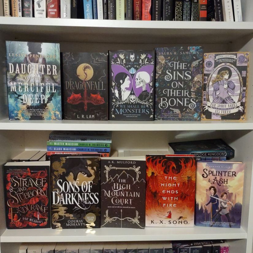 Daughter of the Merciful Deep by Leslye Penelope, Dragonfall by L.R. Lam, We Shall Be Monsters by Tara Sim, The Sins on Their Bones by Laura R. Samotin, The Spirit Bares Its Teeth by Andrew Joseph White, A Strange and Stubborn Endurance by Foz Meadows, Sons of Darkness by Gourav Mohanty, The High Mountain Court by A.K. Mulford, The Night Ends With Fire by K.X. Song, Splinter & Ash by Marieke Nijkamp