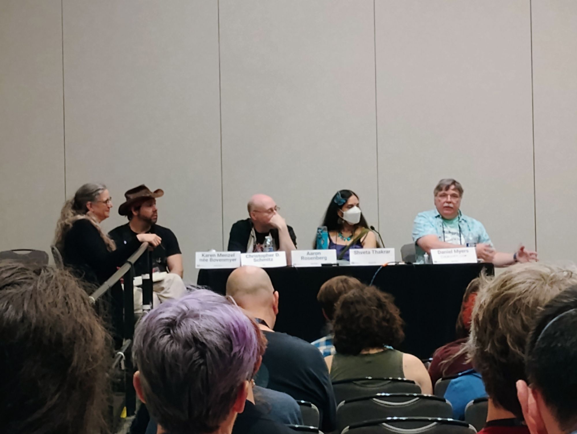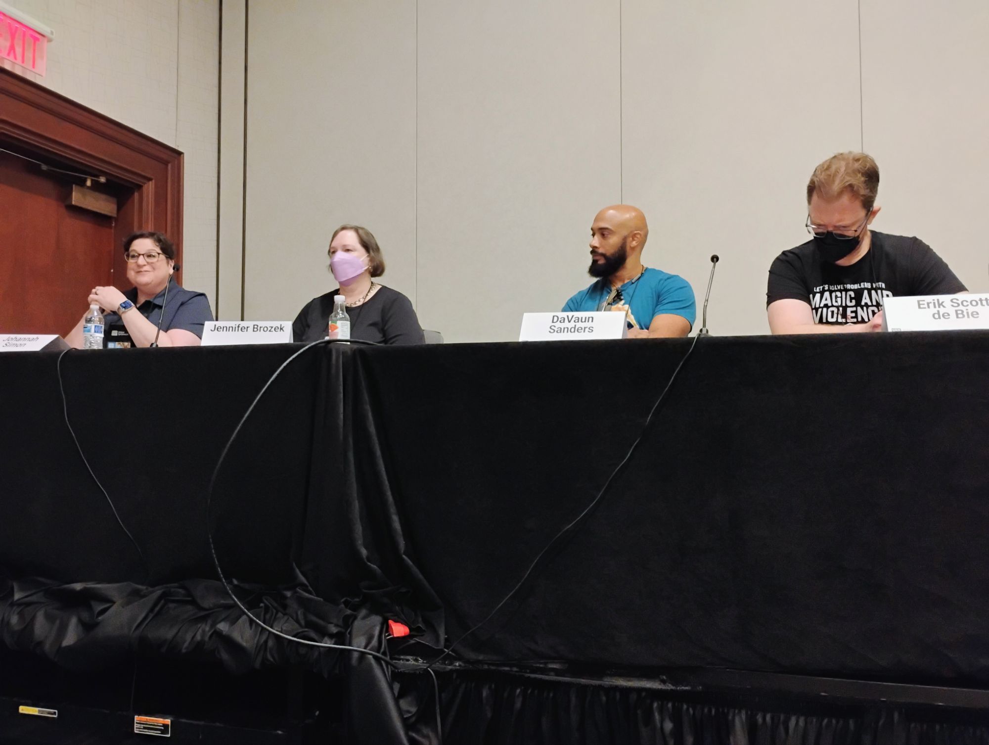 I actually skipped a couple of my panels today so I could spend a little more time walking the vendor’s hall and trying games on the floor. I did go to Drawing Inspiration from Religions and Myth and the panel I was most looking forward to Writing Despite Existential Crisis or Despair.