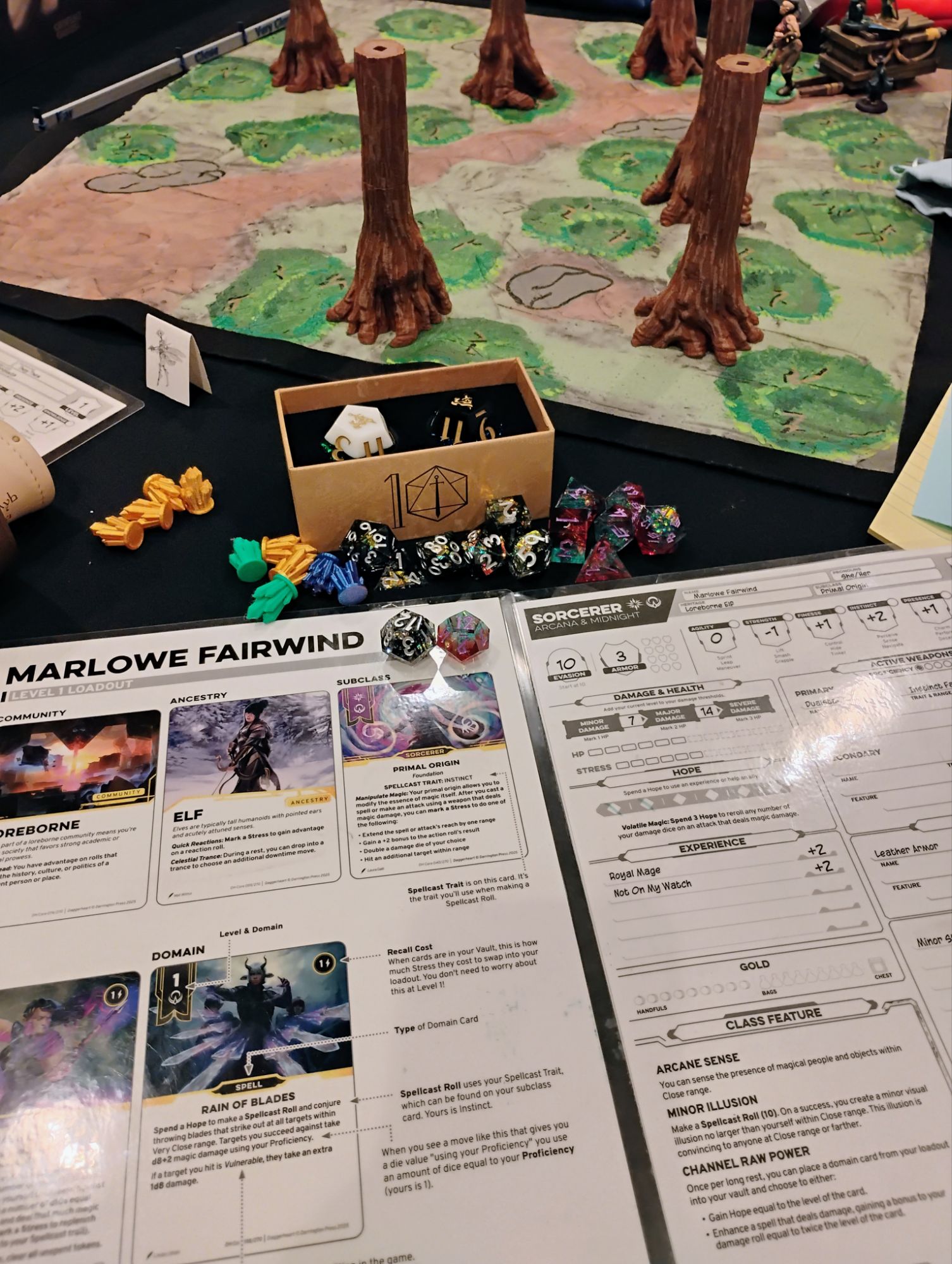 The tables of Daggerheart were set up for 6 players and the Game Master, and David and I ended up getting seated with a group of four. I know in these scenarios it can be easy to basically stick with your group, but these four guys so eagerly jumped into figuring out how to have all of our characters be connected and to make sure we could all have great moments for spotlight in and out of combat, and it was a really nice time.