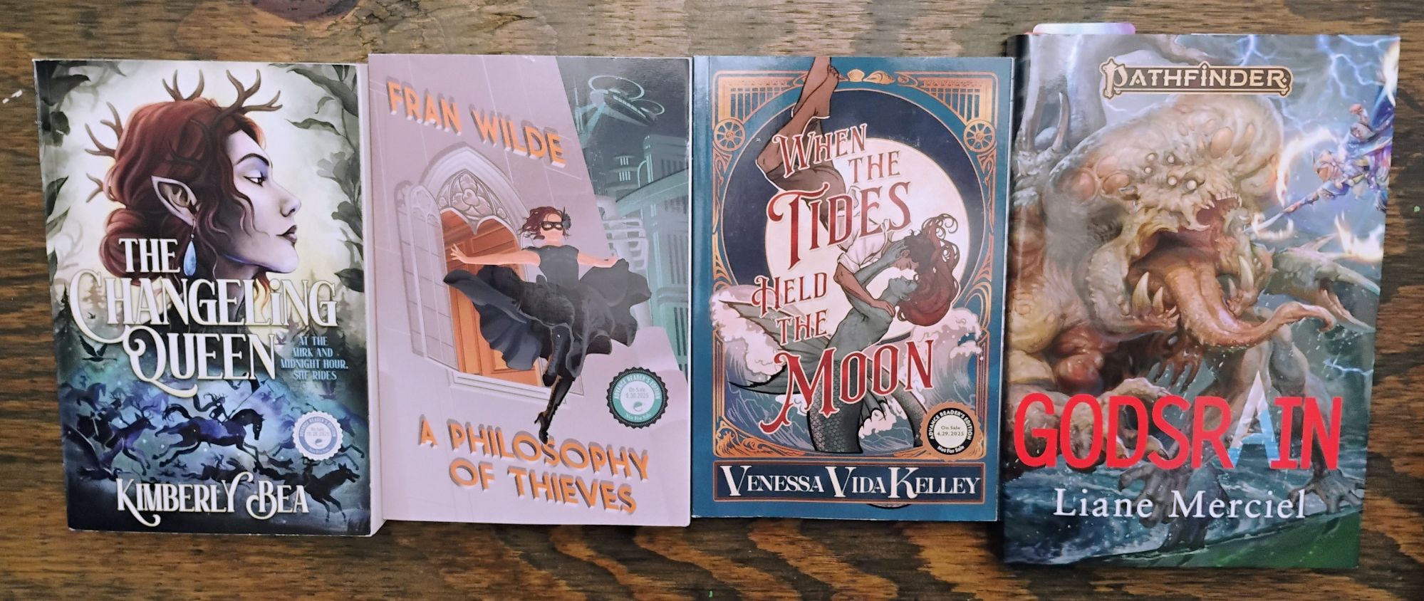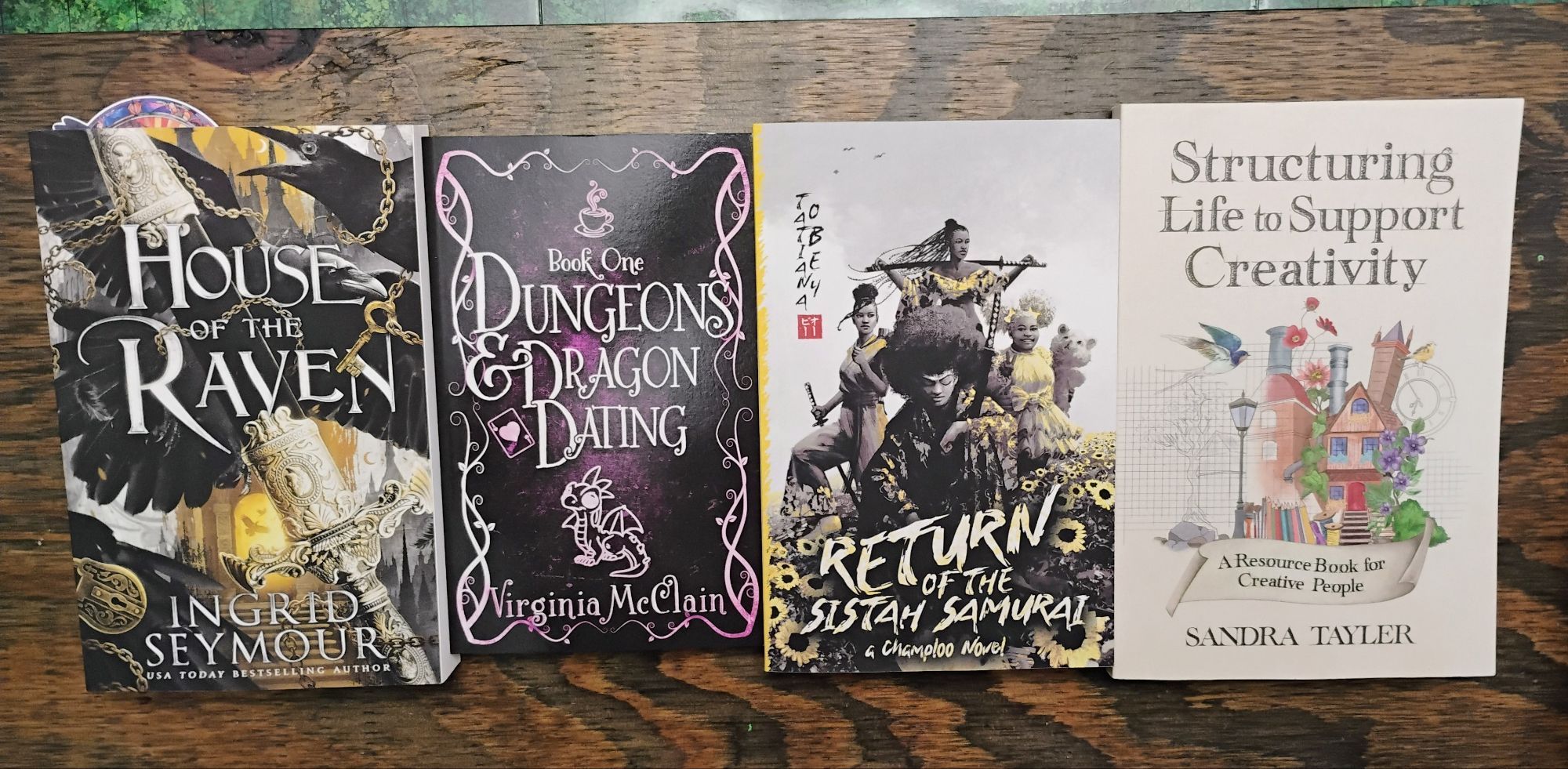 The other two photos are the books I picked up, either from Author’s Avenue in the Vendor’s Hall, or as a freebie at the Writers Symposium. So I got House of the Raven by Ingrid Seymour, Dungeons & Dragon Dating by Virginia McClain, Return of the Sistah Samurai by Tatiana Obey, Structuring Life to Support Creativity: A Resource Book for Creative People by Sandra Tayler (this is a pre-press edition with bonus typos. The fully finished edition will be out soon), an ARC of The Changeling Queen by Kimberly Bea, an ARC of A Philosophy of Thieves by Fran Wilde, an ARC of When the Tides Held the Moon by Venessa Vida Kelley, and Godsrain by Liane Merciel.